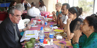 Ναμαστε λοιπον για 4η χρονια στο Ντουμπαι τον παραδεισο του καταναλωτισμου,της ραγδαιας οικιστικης αναπτυξης, μια Ντισνευλαντ μακρυα απο καθε πραγματικοτητα χτισμενη πανω στην ερημο με βαση το πετρελαιο οσο υπαρχει ακομη στη περιοχη εδω χτιζεται ενας ψευτικος παραδεισος Πριν απο 5 χρόνιατο σινεμα απαγορευοταν στη χωρα, οπως ακομη απαγορευεται στη Σαουδικη Αραβια, σημερα όμως το Ντουμπαι φιλοξενει ενα απο τα πιο πολυεξοδα κινηματογραφικά φεστιβαλ του κοσμου.Εγω εδω επιλεγω τα ντοκυμαντερ Η ομαδα προγραμματισμου του Φεστιβαλ προερχεται απο καθιερωμενα διεθνη φεστιβαλ του κοσμου Ροττερνταμ, Λονδινο,Κεραλα Βανκουβερ κλπ και κανει εξαιρετικη δουλεια Εδω και 2χρονια αρχισε και ο διαγωνισμος των Αραβικων ταινιων με καλλιτεχνικο διευθυντη τον Αραβα ποιητη και συνεργατη μου στη ταινια 'Κρατησε Με' Μασουντ Αμραλλα. Ετσι το φεστιβαλ του Ντουμπαι αποτελει πια μια μοναδικη ευκαιρια να ενημερωθει κανεις για τη συγχρονη παραγωγη στις Αραβικες χωρες.Ηδη εχουν αρχισει δειλα να γινονται οι πρωτες ταινιες με υπογραφη σκηνοθετων απο τα Ηνωμενα Αραβικα Εμιρατα.. στη φωτογραφια οι συναδελφοι μου στην ομαδα προγραμματισμου στη πρωτη σημερινη μας συναντηση στο Φεστιβαλ ενω τρωμε σε ενα Λιβανεζικο εστιατοριο και μελεταμε τις τελευταιες τεχνικες λεπτομερειες της διοργανωσης